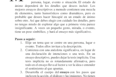 En este tipo de ensayo, el autor describe un objeto, persona, lugar o situación de manera detallada. El objetivo es que el lector pueda visualizar lo que se está describiendo.